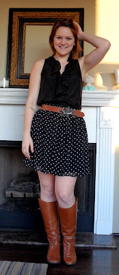Something about this outfit makes me want to go square dancing.  Maybe it's the ruffly top, the twirly skirt, or the knee-high boots...whatever it is, it's got me tappin' my toes to a country song.  The only one I really know all the words to, "Dry Town" by Miranda Lambert.  At least it's a good one!