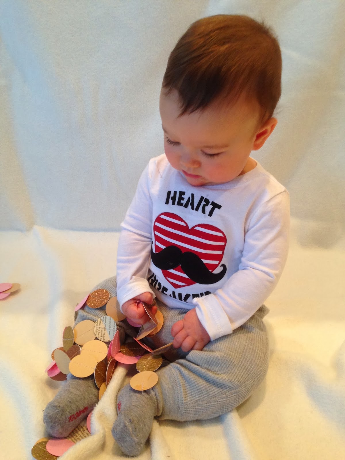 To kill some time and keep August occupied, we did a little Valentine shoot with him yesterday morning. It was really fun! I used a paper garland Haley made for my bachelorette party (nearly 2 years ago to the day!) and a big ivory blanket for a background, and just let August be cute for 20 minutes. What a fun way to to document his first Valentine's Day!